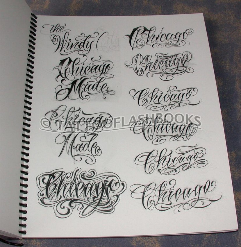 Extremely thick ring-bound script guide with heavy stock pages filled with hundreds of script designs, alphabets, and lettering by Chicago tattooer and master of script, Sir Twice.